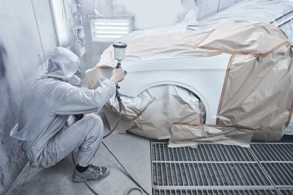 peint une voiture avec un pulvérisateur d’aérographe dans la cabine de peinture